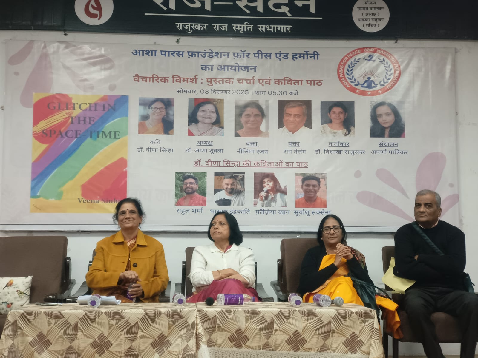 आशा पारस फॉर पीस एंड हारमनी फाउंडेशन, भारत द्वारा प्रकाशित ,सुप्रिसिद्ध कवियित्रि और चिकित्सक डॉ. वीणा सिन्हा द्वारा लिखित काव्य पुस्तक GLITCH IN THE SPACE TIME पर केंद्रित "पुस्तक चर्चा एवं कविता पाठ" का आयोजन भोपाल के दुष्यंत कुमार स्मारक पांडुलिपि संग्रहालय में किया गया। अध्यक्षता पूर्व कुलपति प्रो. आशा शुक्ला द्वारा की गई , उन्होंने कविता के माध्यम से पुस्तक की वैचारिक व्याख्या की ।मुख्य अतिथि के रूप में सुप्रिसिद्ध कवि राग तेलंग और वक्ता के रूप में नीलिमा रंजन ने वक्तव्य प्रदत्त किये । डॉ. विशाखा राजुरकर द्वारा GLITCH IN THE SPACE TIME पुस्तक पर डॉ वीणा सिन्हा से प्रश्नोत्तरी के माध्यम विषय को विस्तार दिया और चर्चित कविता पाठ -, युवा कवियों राहुल शर्मा, भास्कर इंद्रकांती, फ़ौजिया खान और सूर्यांसू सक्सेना द्वारा डॉ. वीणा सिन्हा द्वारा लिखित काव्य पुस्तक से किया गया । स्वागत वक्तव्य करुणा राजुरकर और आभार वक्तव्य लव चावड़ीकर द्वारा प्रदत्त किया गया । कार्यक्रम में वरिष्ठ कवियों, साहित्यकारों, मीडिया प्रतिनिधियों सहित सैकड़ों लोगों ने प्रतिभागिता की।